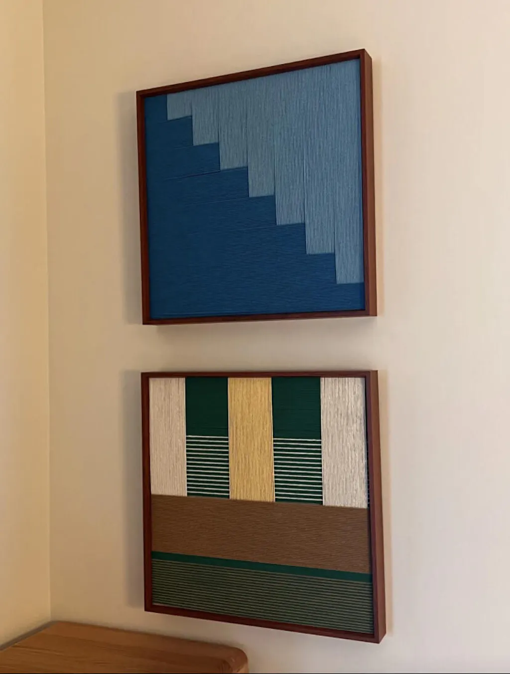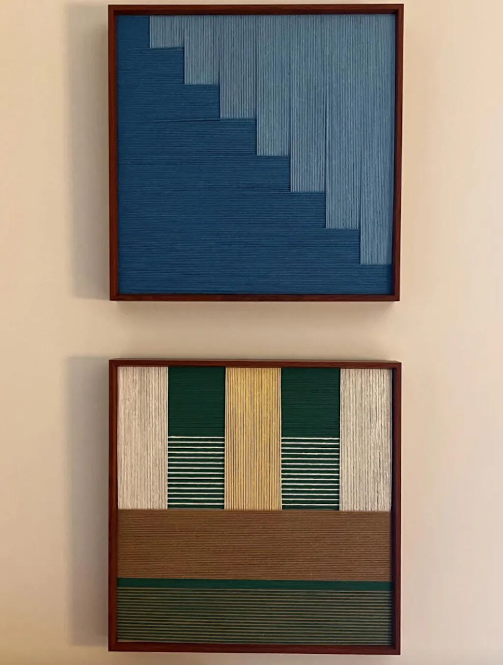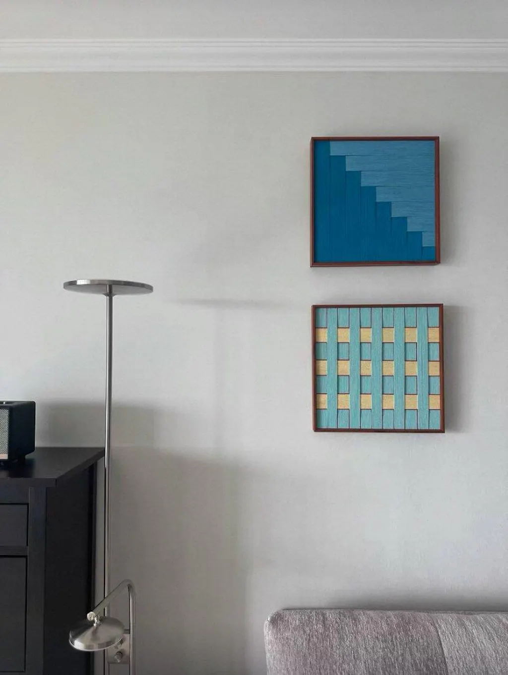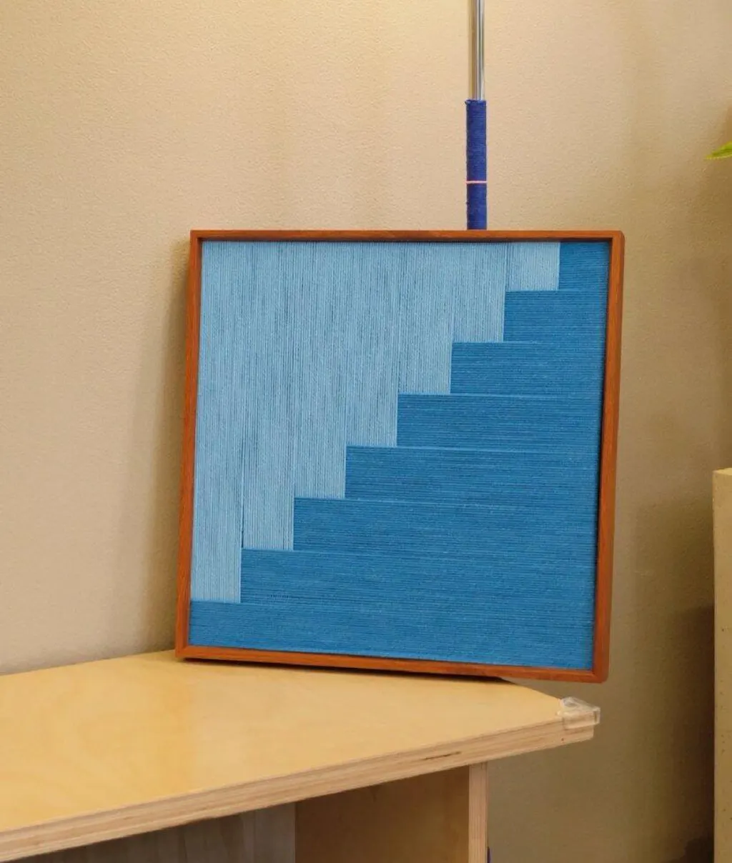 "Azure Sky Woven" is a study in serenity and structure. It evokes the feeling of looking up at a clear sky, where the vibrant intensity of the zenith meets the pale softness of the horizon. The artwork features a striking diagonal composition created by a "stepped" geometric line. The true magic lies in the texture: the azure section is wrapped vertically, while the pale blue section is wrapped horizontally. This directional contrast means the light catches the fibers differently, creating a dynamic, woven appearance that shifts as you move around the room.
