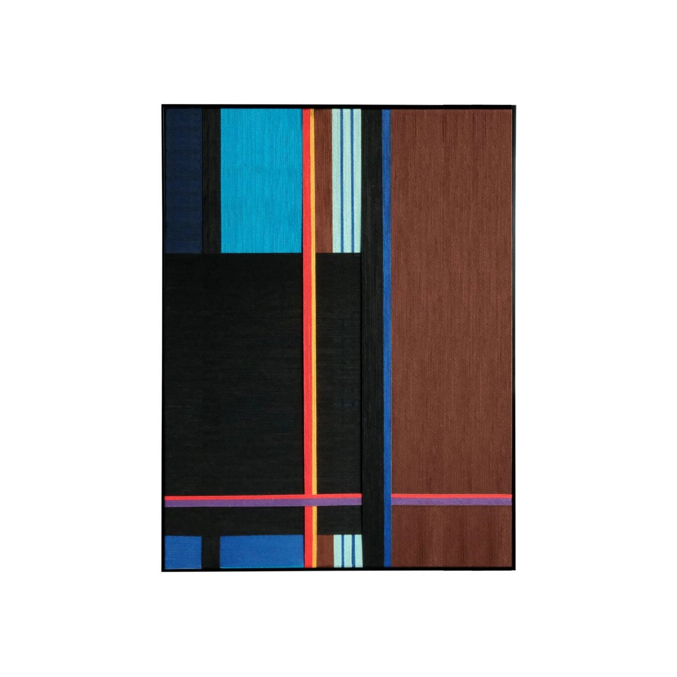Angled view of Blue Tide Night Run yarn wall art showcasing the tactile looped wool texture and crisp transitions between blue and black stripe panels.