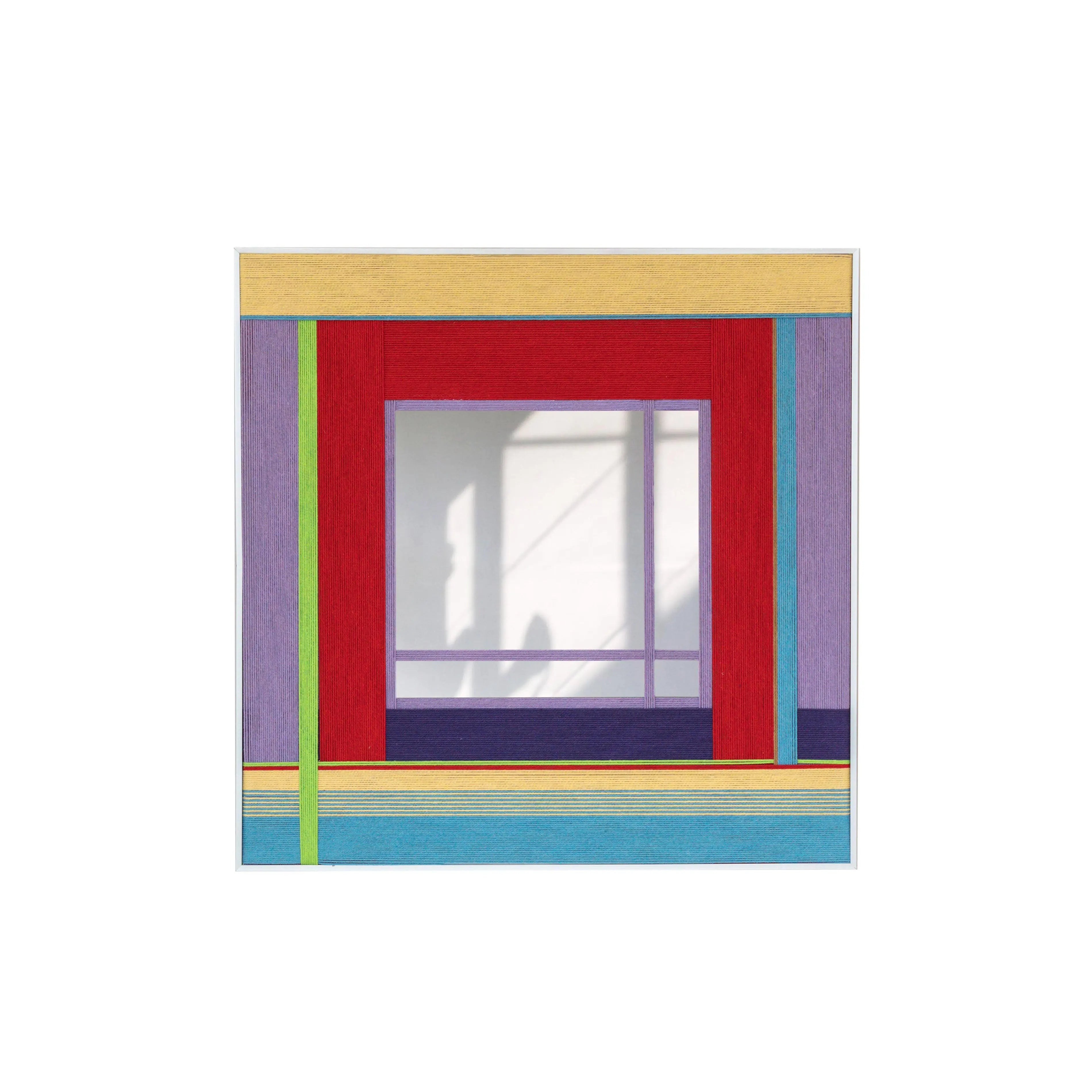 Bohemian Reverie yarn mirror art resting on a desk beside a yellow ball and cup, emphasizing its compact square form and bold frame.