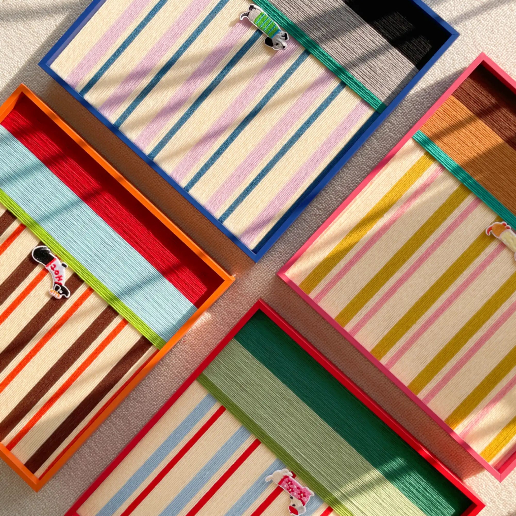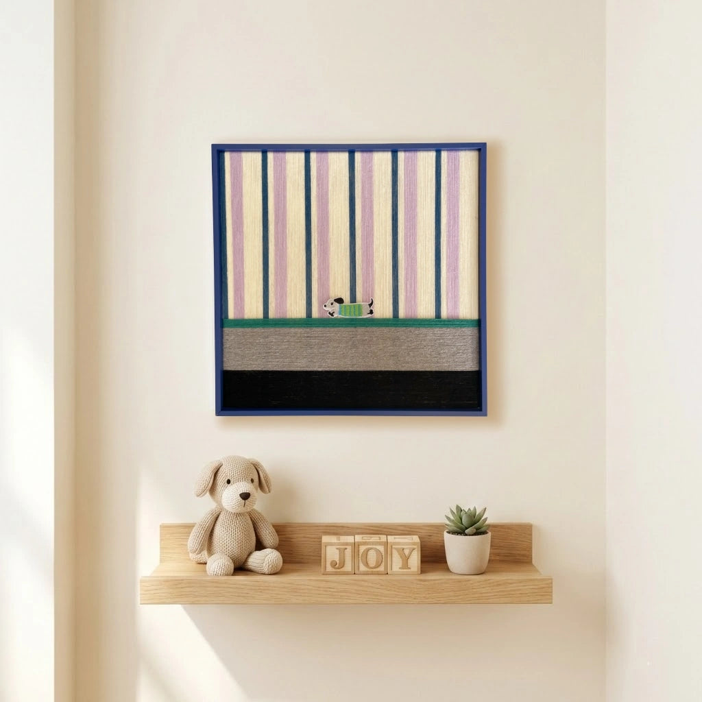 The Vibe: Whimsical Energy & Retro Stripes "Cerulean Stripe Pup Frolic" brings a lighthearted, vintage charm to your wall, capturing the fun of a playful puppy. This structural art piece is created through the meticulous technique of hand-wrapped yarn. The background is filled with vertical stripes of soft cerulean blue, lilac pink, and creamy yellow, creating a cheerful, retro atmosphere. The lower section anchors the piece with layers of moss green, light grey, and deep black yarn, suggesting grass and shadow. The focal point is a delightful dachshund appliqué wearing a green and blue striped sweater, mid-frolic.