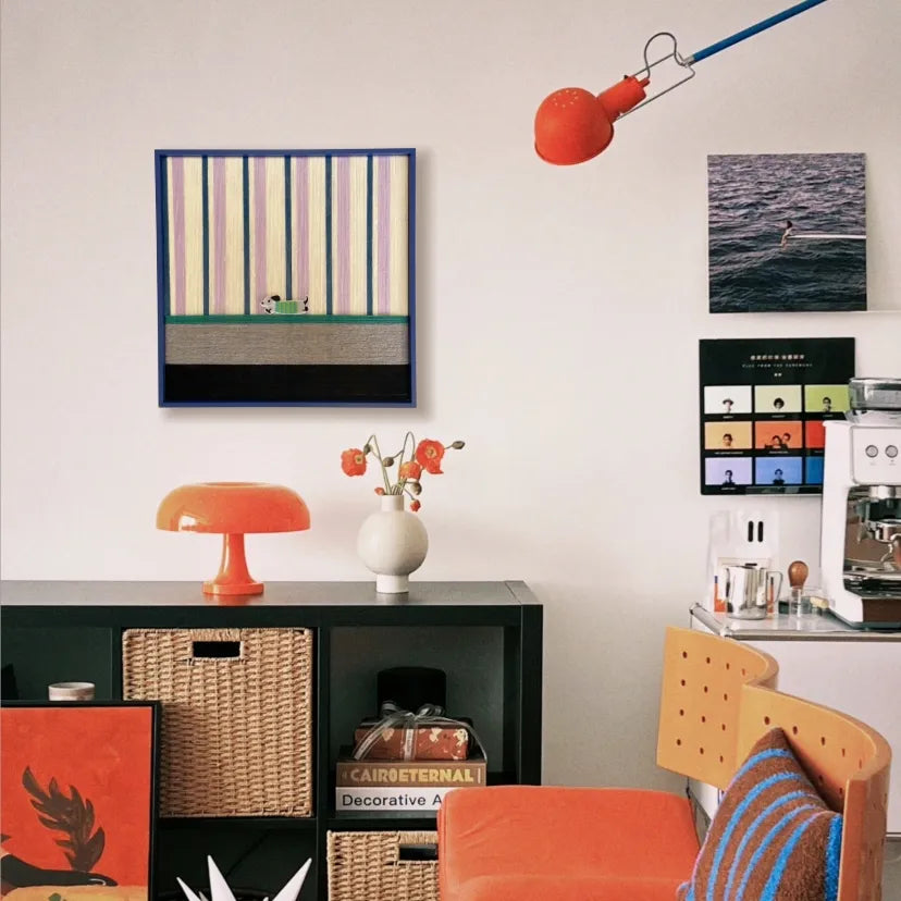Encased in a sleek metal frame, this artwork combines structured design with nostalgic, playful fun.