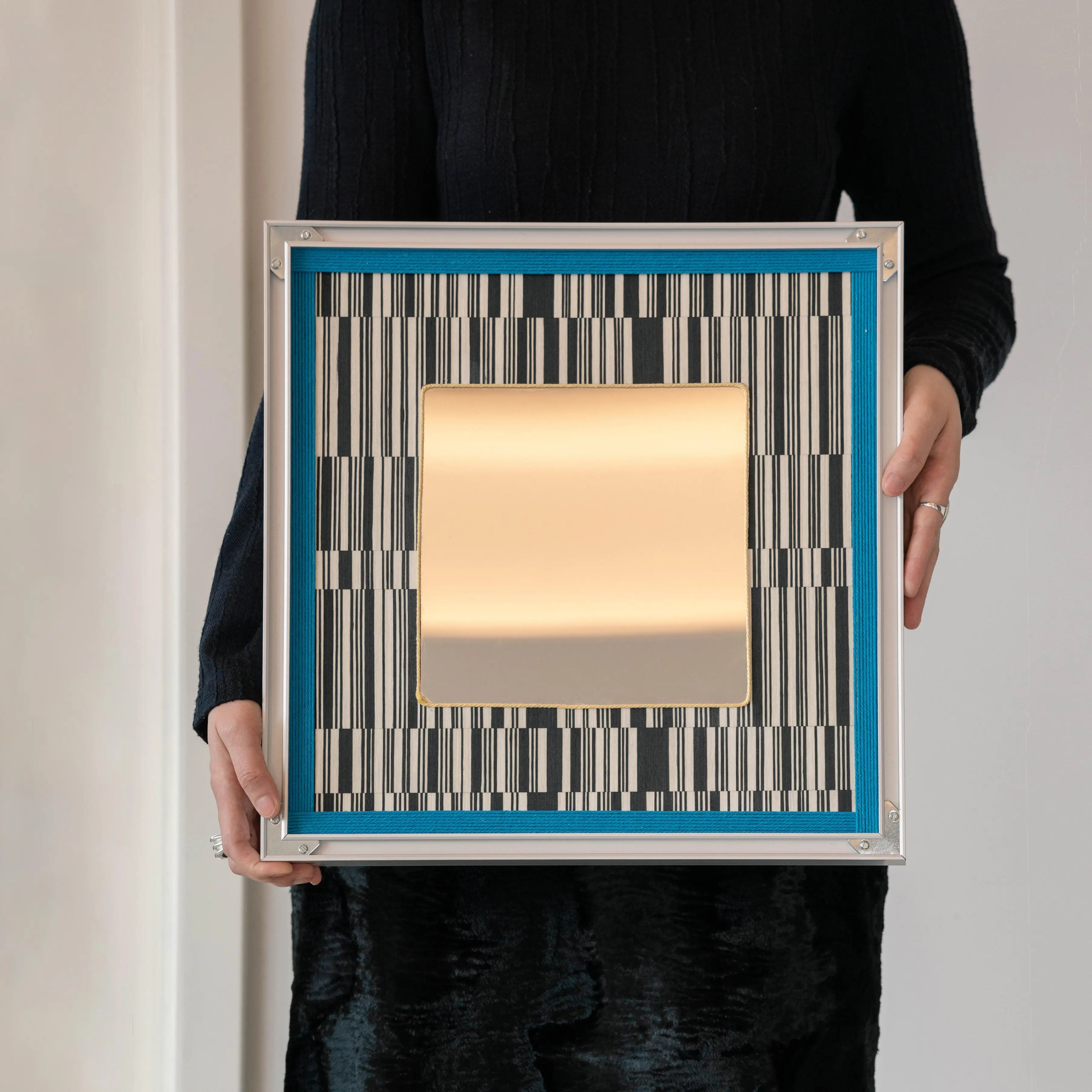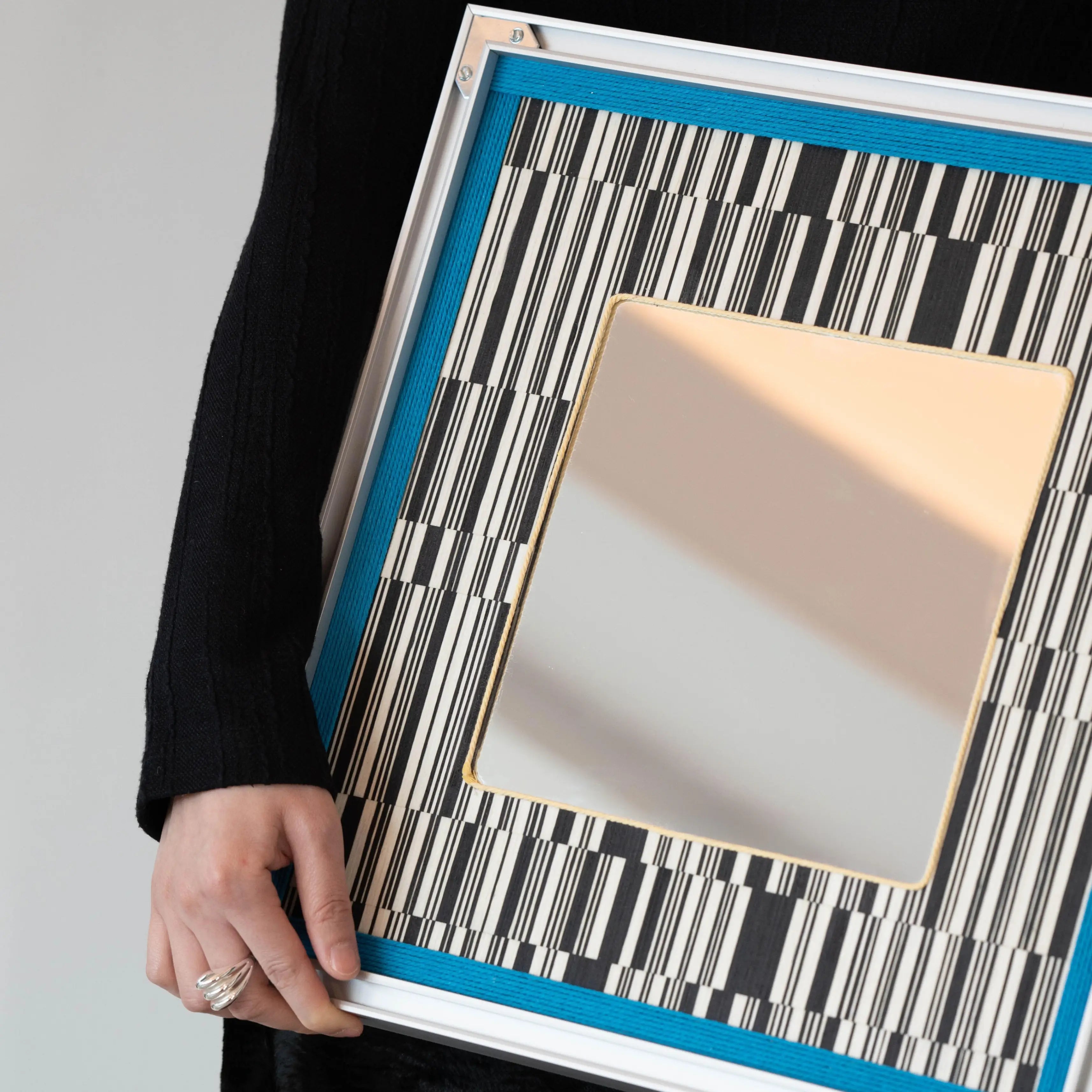 Inception hand-woven wool yarn wall art with integrated square mirror center and alternating oatmeal and sky-blue stripe panels in a natural wood frame, showcased on a tabletop