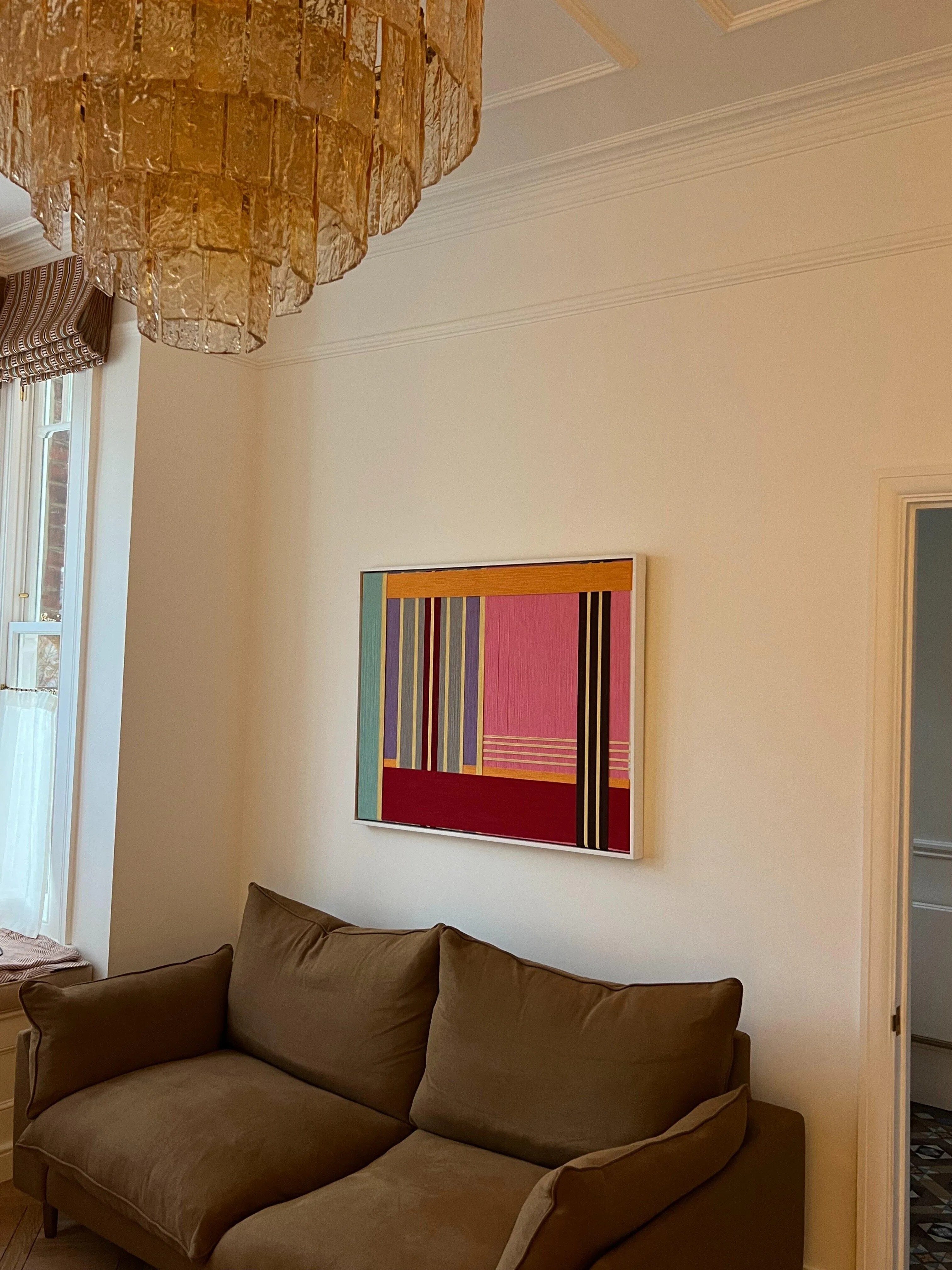 Encased in a clean white frame, the pastel and bold tones pop beautifully, making it a fresh addition to any space.
