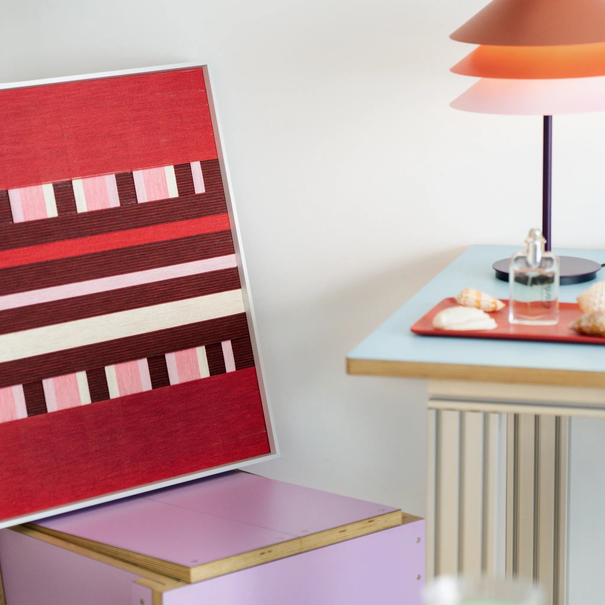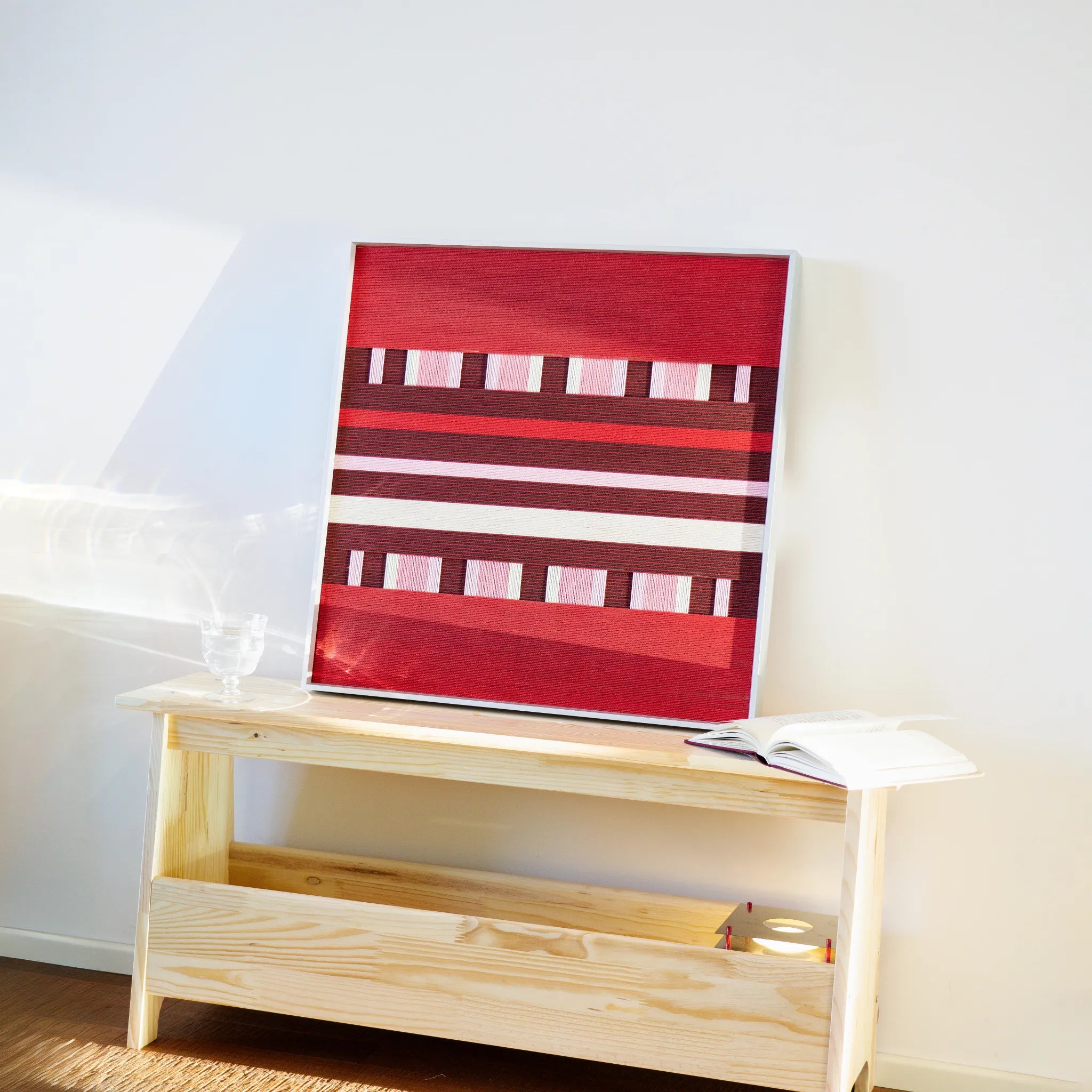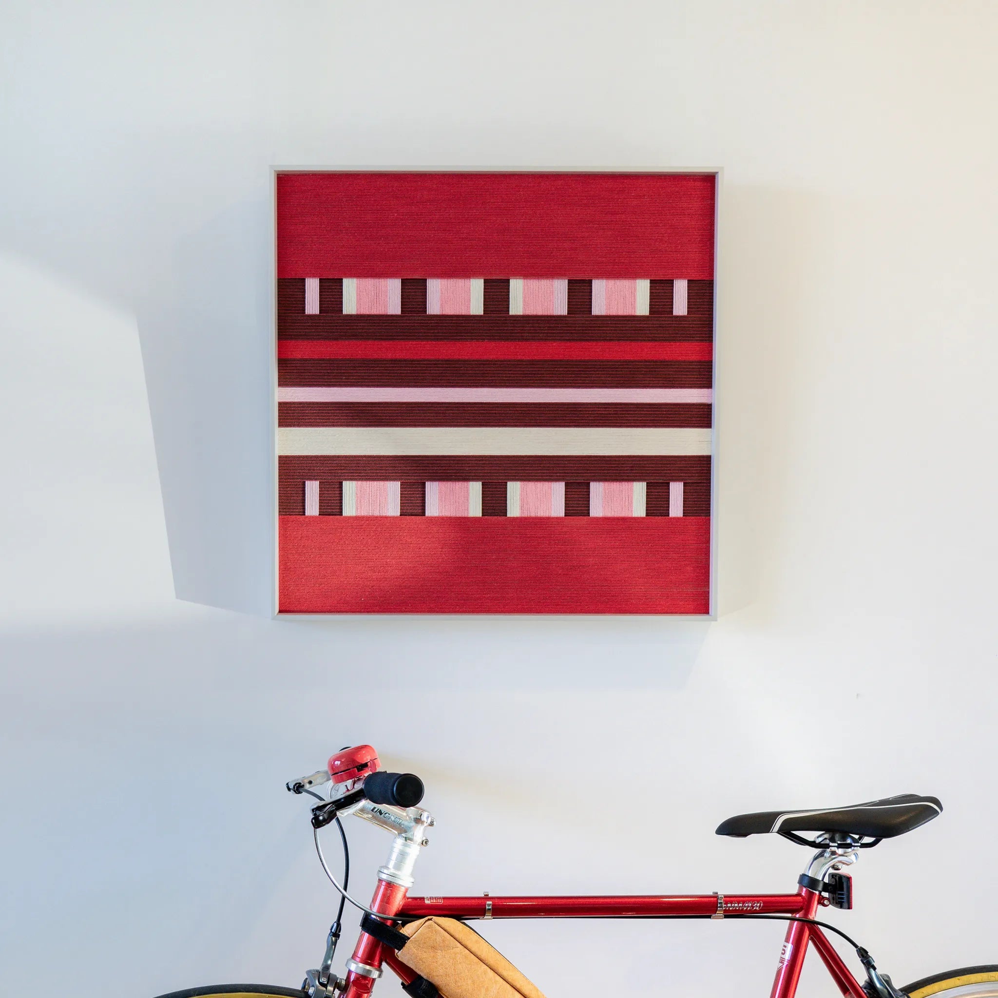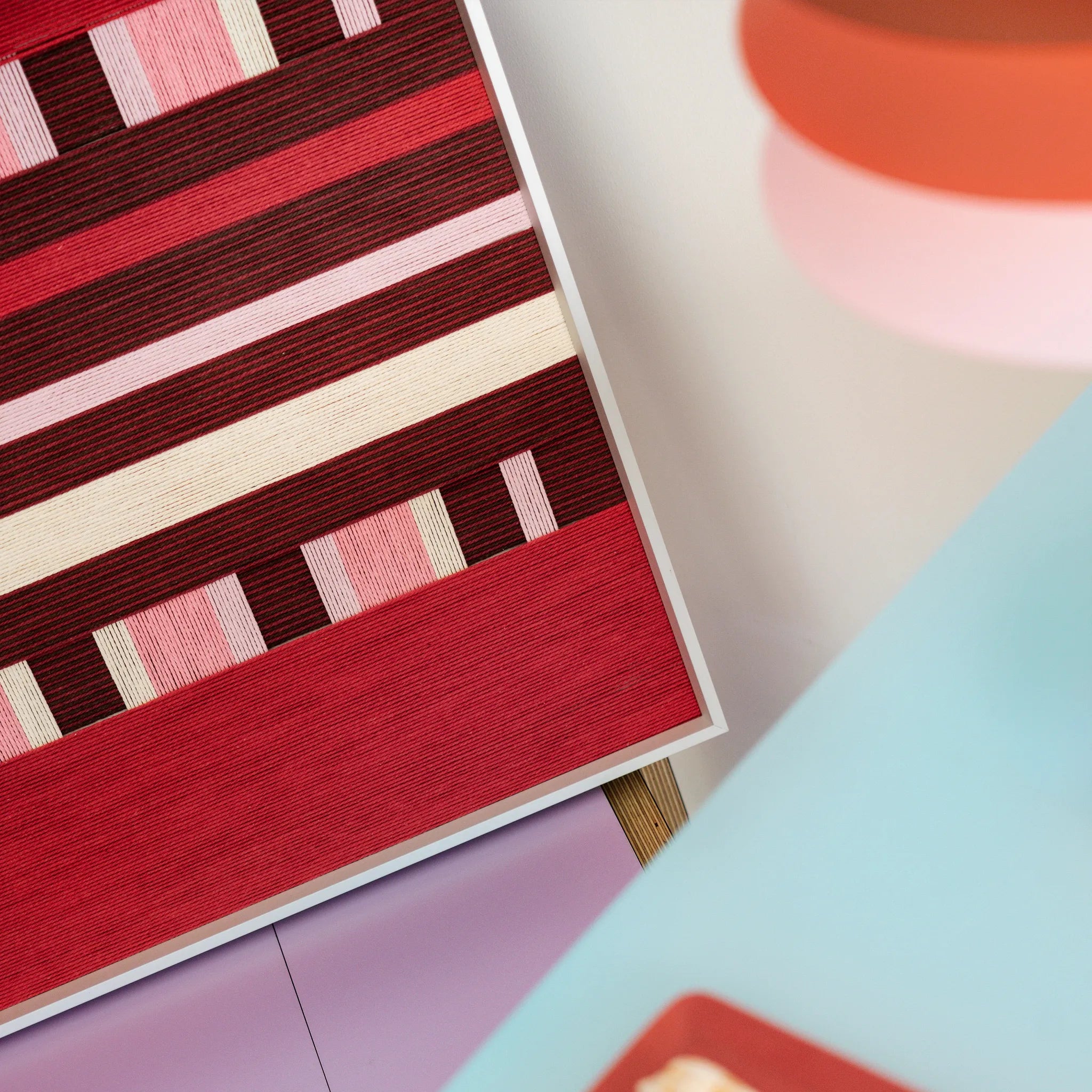 "Spring Miss" captures the vibrant energy of a garden in full bloom. The composition is anchored by bold blocks of bright red at the top and bottom, representing vitality and passion. The center features a sophisticated, intricate "lattice" structure where vertical strands of soft pink and cream interweave with horizontal bands of deep burgundy. This creates a delightful architectural rhythm, reminiscent of a garden trellis or a traditional woven textile. It is warm, romantic, and richly detailed.