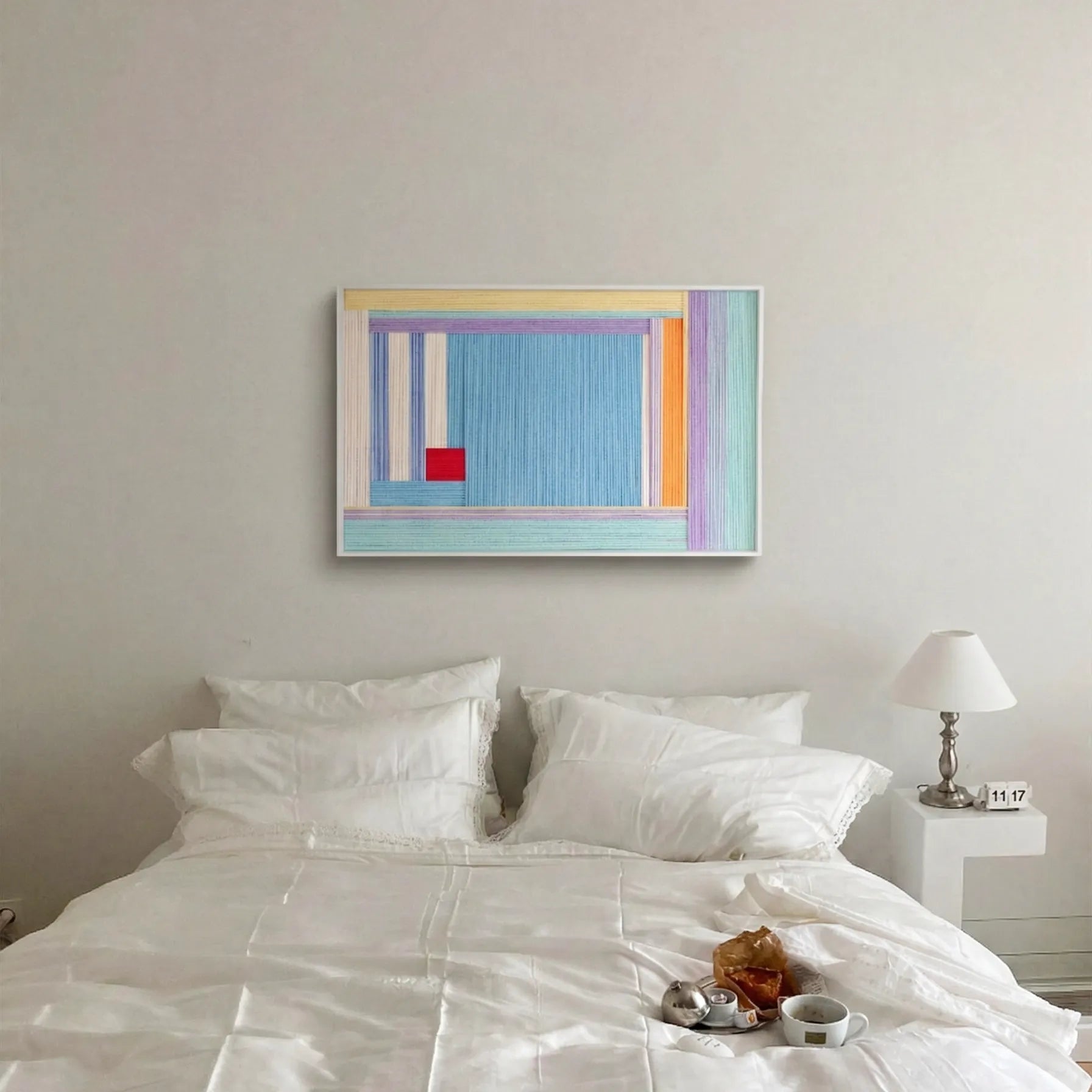 Step into a sunny state of mind with "Summer Letter." This striking piece uses meticulously hand-wrapped yarn to create a geometric composition reminiscent of a clear summer sky. The expansive blue center is beautifully framed by linear bands of lavender, sunny yellow, vibrant orange, and mint green, while striking blue-and-white stripes add a fresh, nautical touch. A single, bold red square serves as a captivating focal point, like a warm stamp on a seaside postcard. Housed in a sleek metal frame, this tactile artwork bridges modern abstraction with cozy, handcrafted warmth.