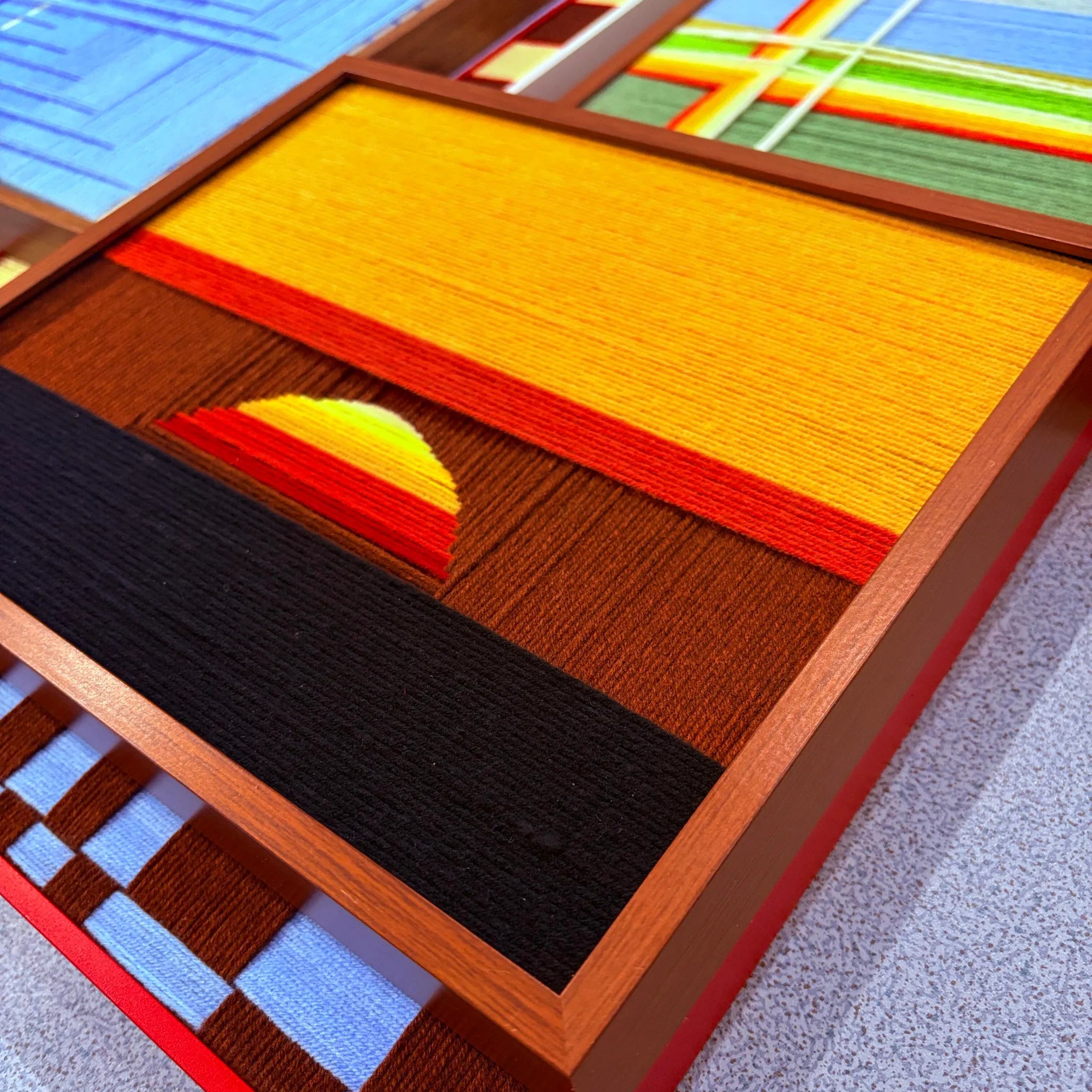 "Sunrise" is a tactile interpretation of the first light breaking over a quiet landscape. By blending rich earthy tones with luminous golden hues, this piece creates an atmosphere of optimism and calm. The meticulous geometric layering of yarn mimics the structured yet soft transition of light at dawn, making it an essential piece for those who appreciate modern artisanal warmth.